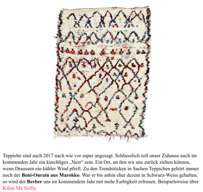 "Was wir im kommenden Jahr mögen - Musthaves 2017": Beni Ourain-Teppiche, z. B über kilimmesoftly.ch