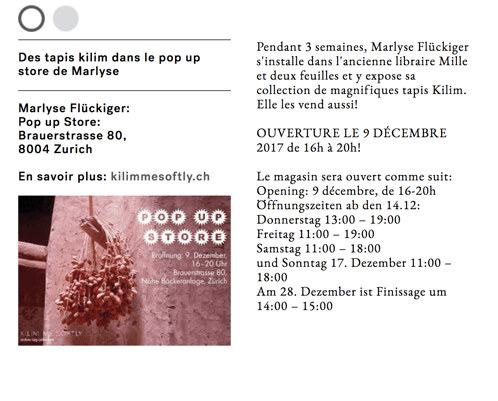 * Opening Pop up Store * in Zurich, 3 weeks, 9th to 28th December 2017!